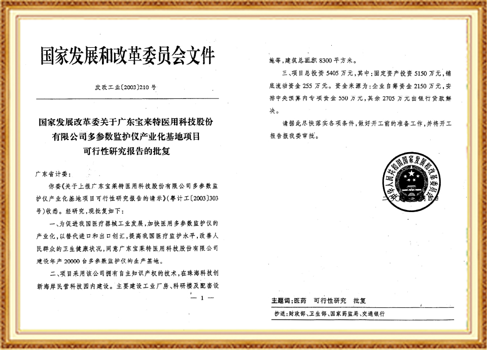 被国家发展与改革委员会授予“国家多参数监护仪产业化基地”