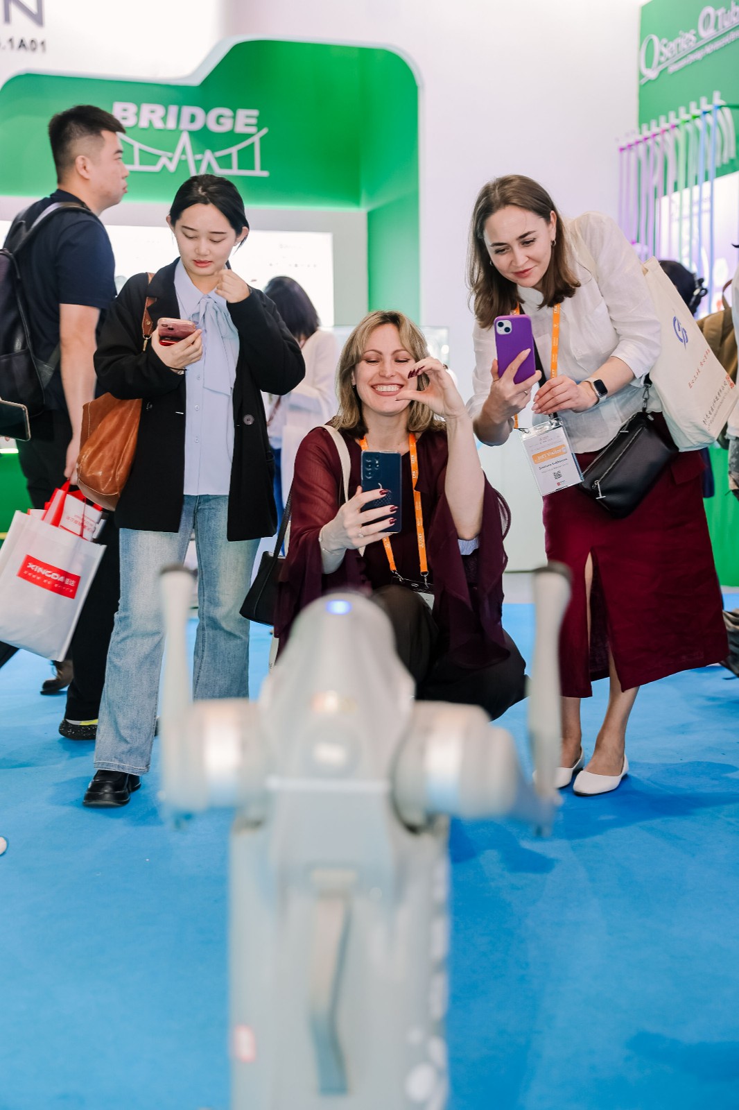 市场总监曾晓淳结合四足机器人动态演示,展示心电设备与远程云平台的协同效能。机器人搭载动态血压监测仪穿越障碍,实时数据同步至心电工作站,诠释“移动精准医疗”理念,观众直呼“未来已来”。